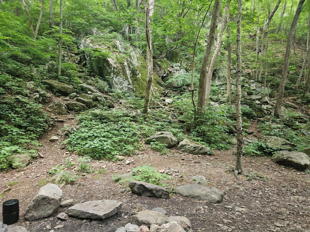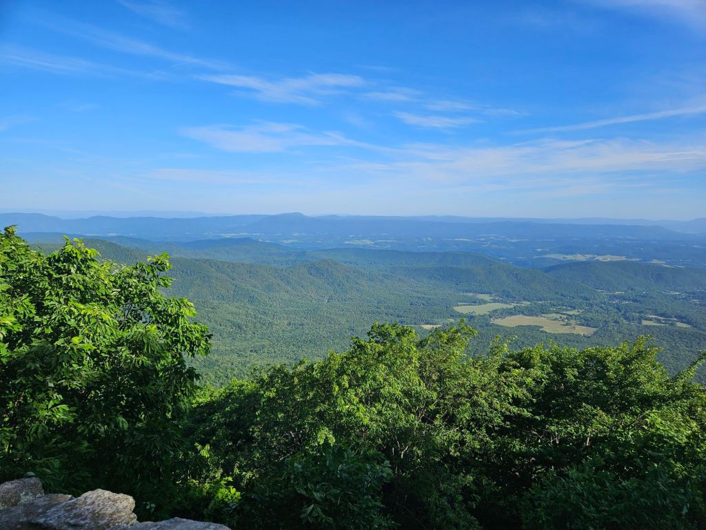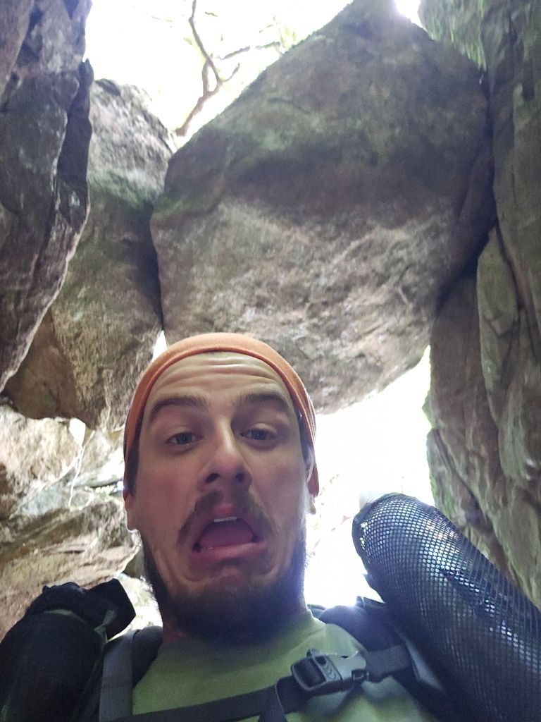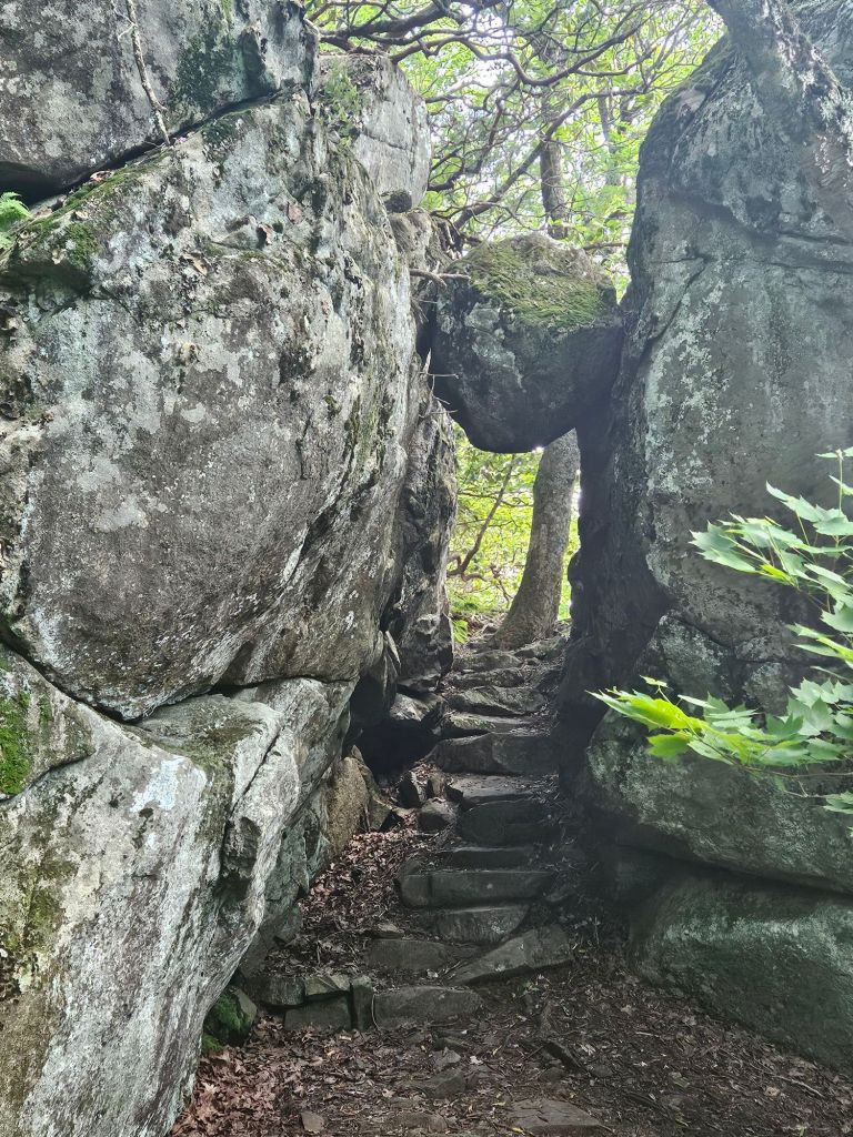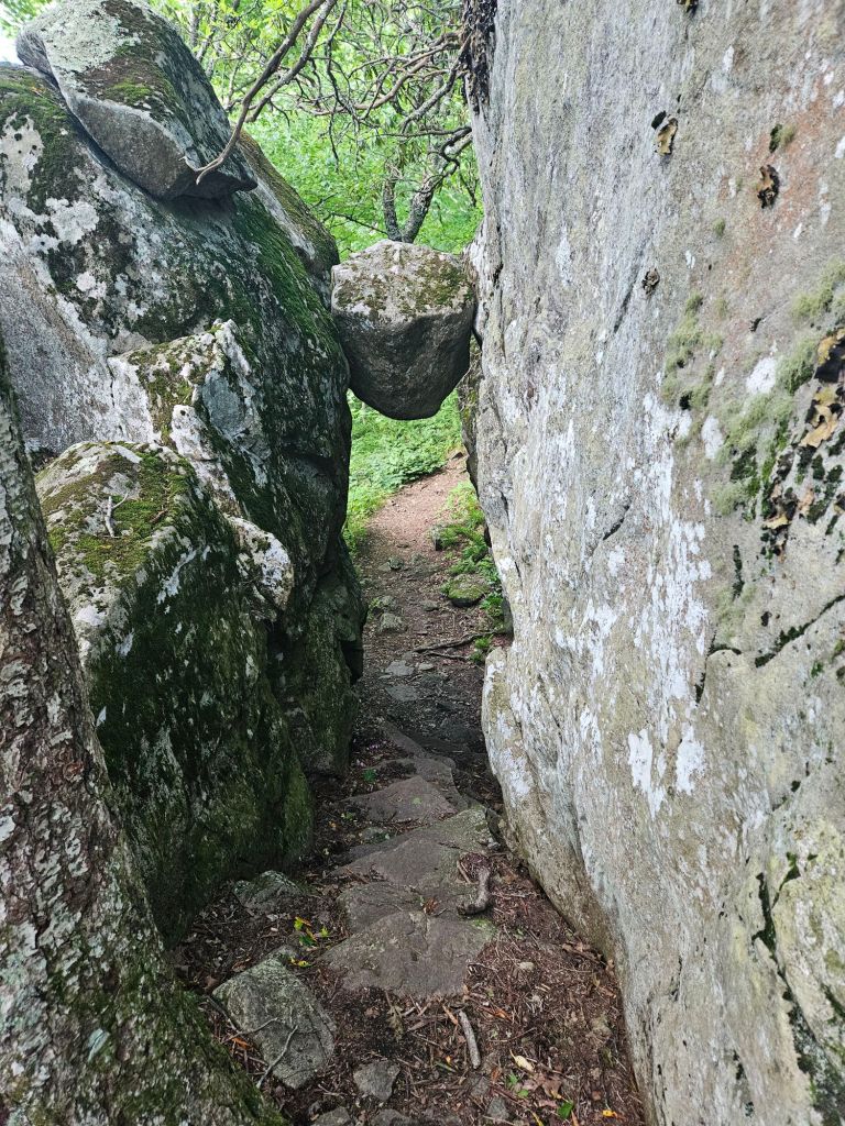 The next day held even more adventure. It began by taking a detour to Middle Creek Campground, where I was able to obtain a generously portioned turkey sandwich before beginning the climb up Apple Orchard Mountain. On the way up, I stopped at a rocky overlook. The view was phenomenal; however, I quickly discovered I was not alone out there. When I went to return to the trail, I noticed a copperhead now guarding my only exit point. Without much else to do, I waited about half an hour for the snake to dip its head back between the rocks before I scurried over them. After that shocking moment, I took my time up the mountain. At the peak was a weather radar, but just past it was the famous “The Guillotine” rock formation, where the trail went directly beneath a suspended boulder.